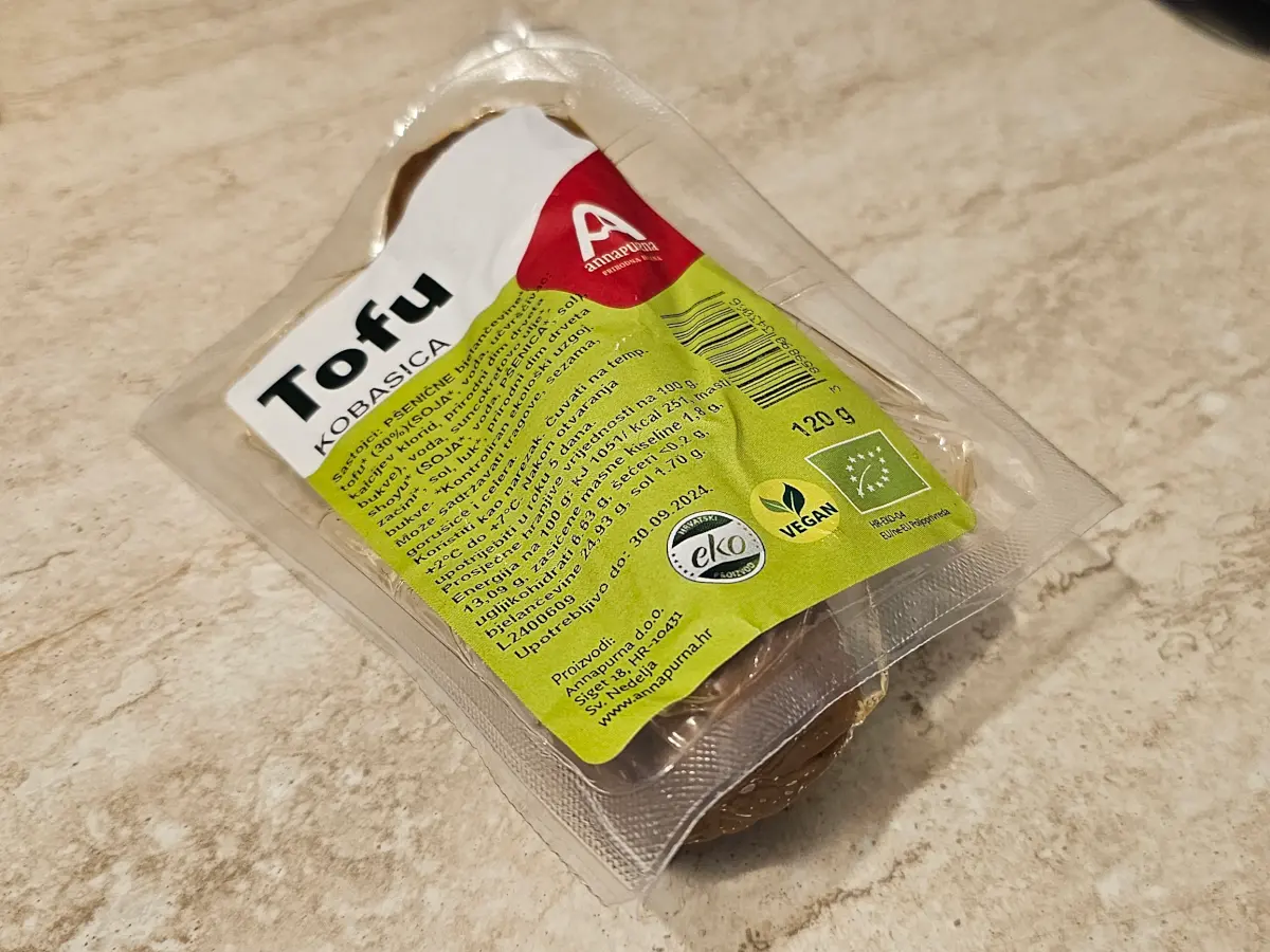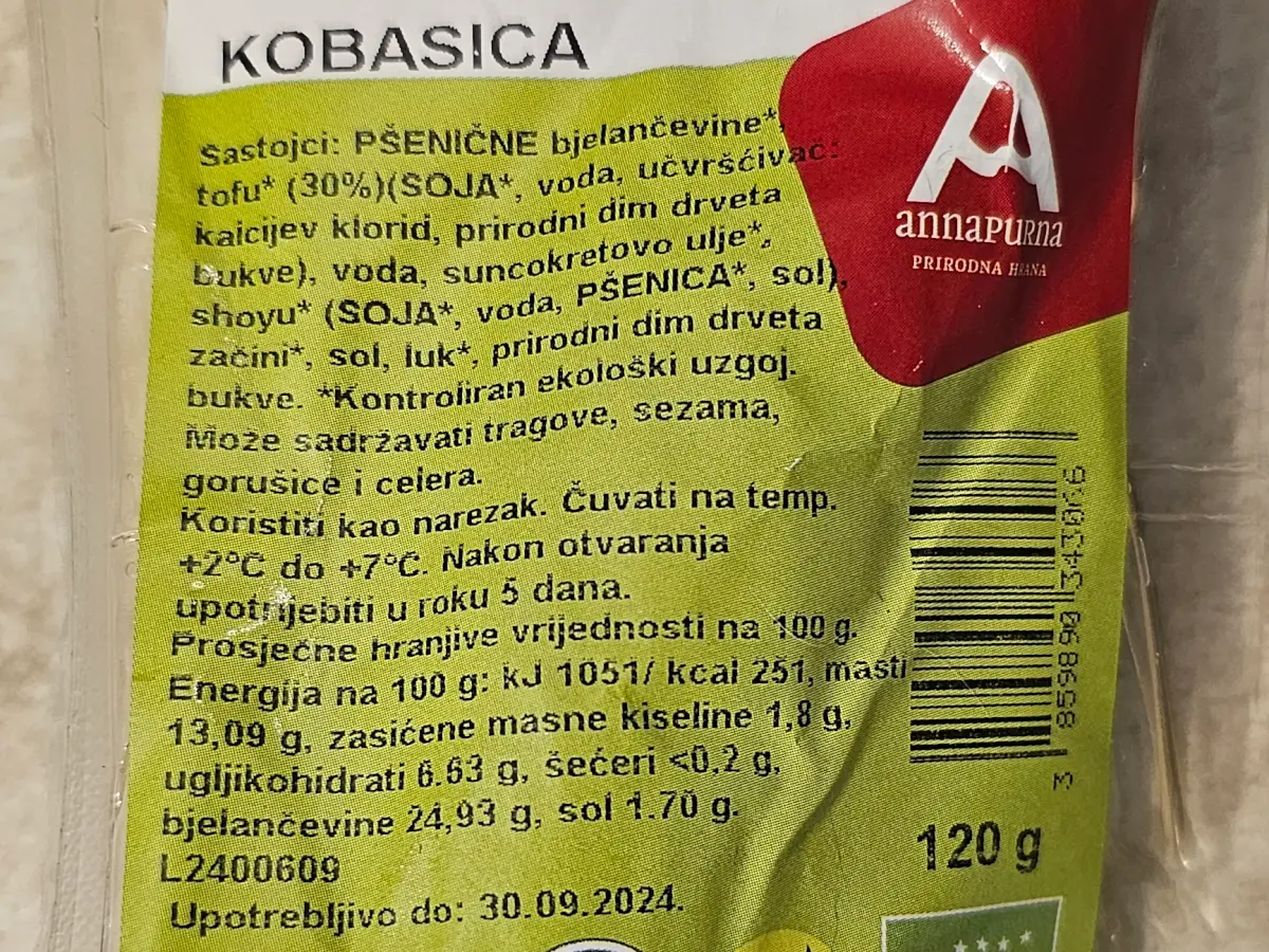 Wheat protein*, tofu* (30 %) (soya beans*, water, coalgulant: calcium chloride, beech wood smoke), water, sunflower oil*, shoyu* (soya beans*, water, wheat*, salt), spices, salt, onions, beech wood smoke.
