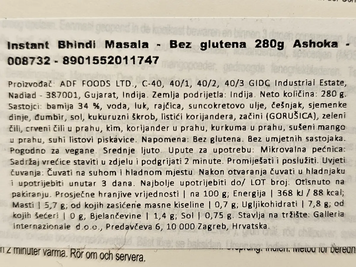 Bamija 34 %, voda, luk, rajčica, suncokretovo ulje, češnjak, sjemenke dinje, đumbir, sol, kukuruzni škrob, listići korijandera, začini (gorušica), zeleni čili, crveni čili u prahu, kim, korijander u prahu, kurkuma u prahu, sušeni mango u prahu, suhi listovi piskavice.