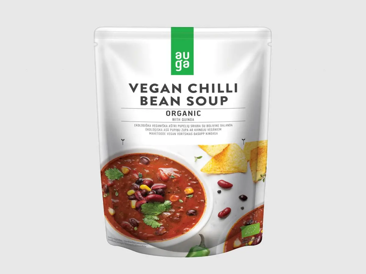 Sastojci: voda, rajčica*, pasta od rajčice*, paprika*, kukuruz šećerac*, crveni grah* 4,1%, crni grah* 4,1%, ulje od repice*, mješavina kvinoje* 1,5% (bijeli 80 %, crveni 15%, crni 5%), pečeni luk* (luk*, suncokretovo ulje*), luk u prahu*, češnjak u prahu*, morska sol, rižino brašno*, šećer*, listovi korijandera*, zelene čili papričice* 0 ,17%.