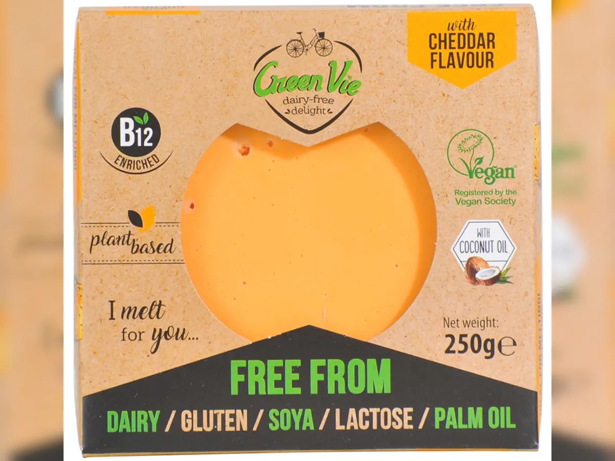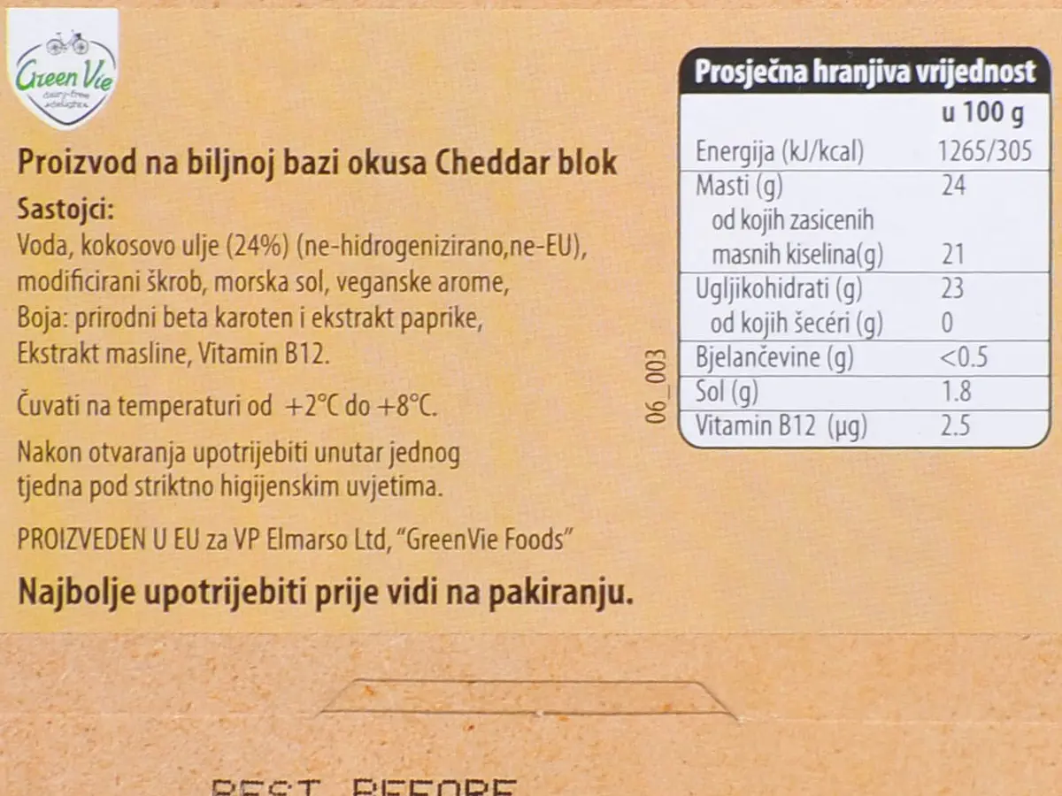 Proizvod na biljnoj bazi okusa Cheddar, blok.Sastav: voda, kokosovo ulje (24 %) (ne-hidrogenizirano, ne-EU), modificirani škrob, morska sol, veganske arome, boja: prirodni beta karoten i ekstrakt paprike, ekstrakt masline, vitamin B12.