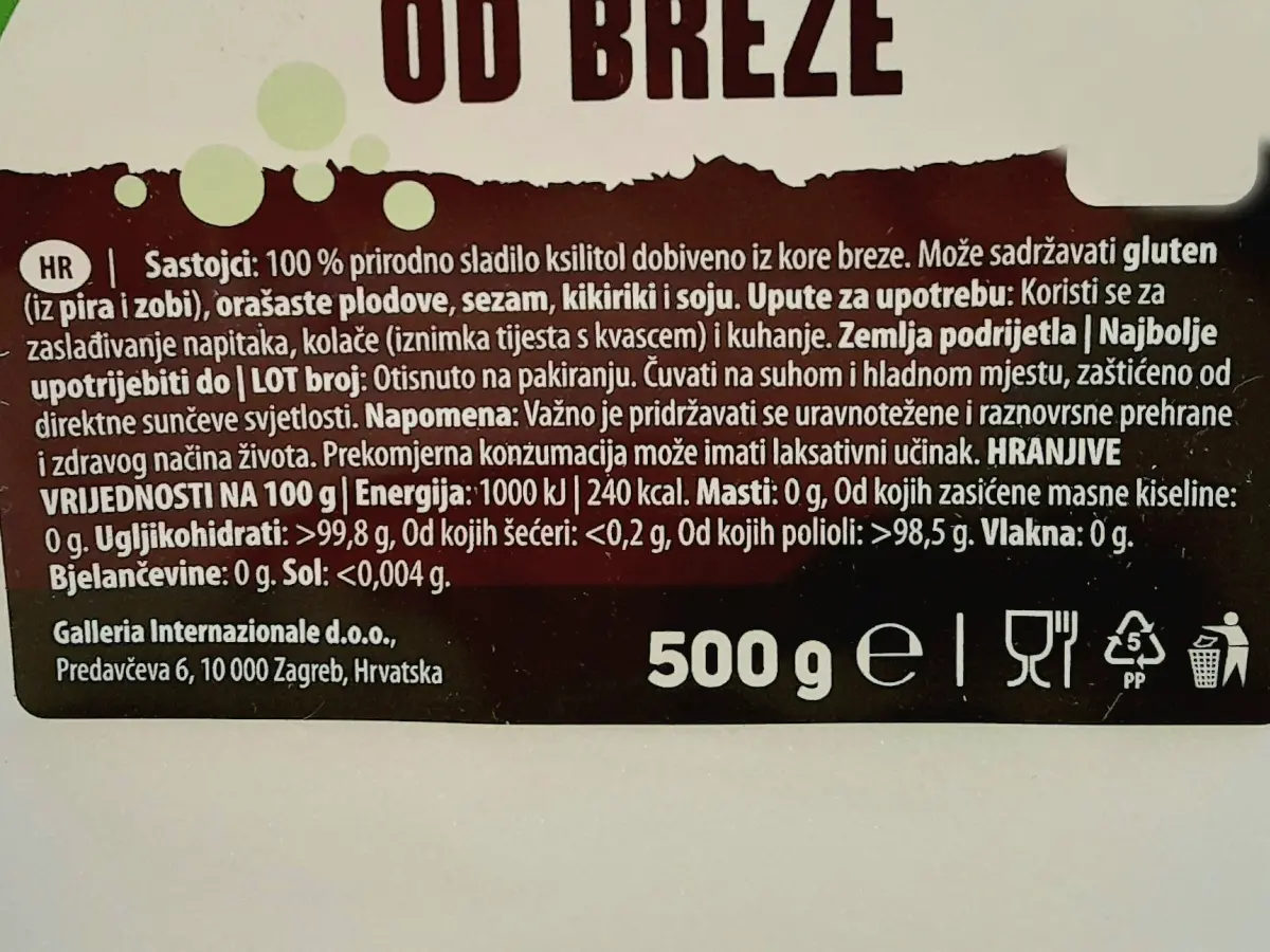 Nutritivna vrijednostEnergetska vrijednost: 1000 kJ / 240 kcalMasti: 0 god kojih zasićene masne kiseline: 0 gUgljikohidrati: 99,8 god kojih šećeri: < 0,2 gBjelančevine: 0 gSol: < 0,01 g