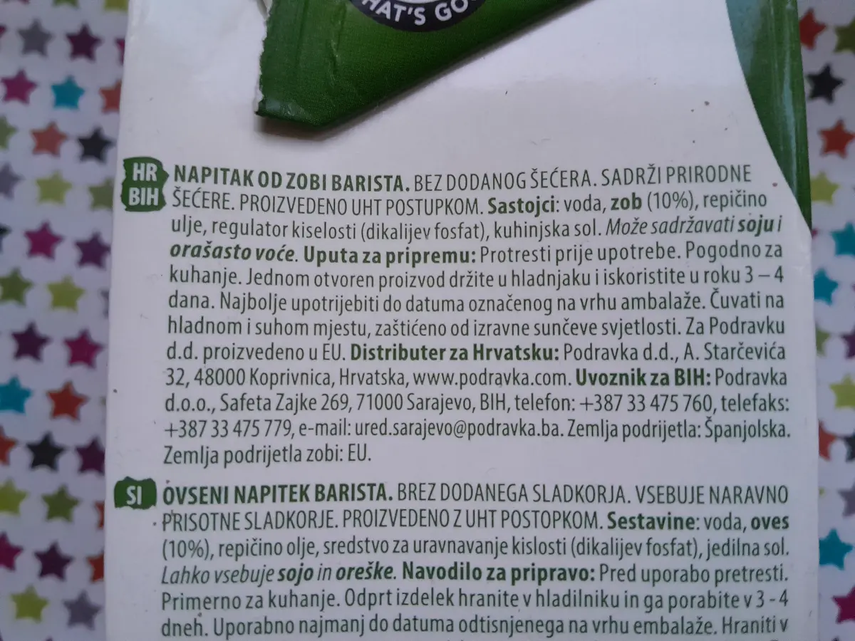 Mlijeko od zobi barista bez dodanog šećera 1 L