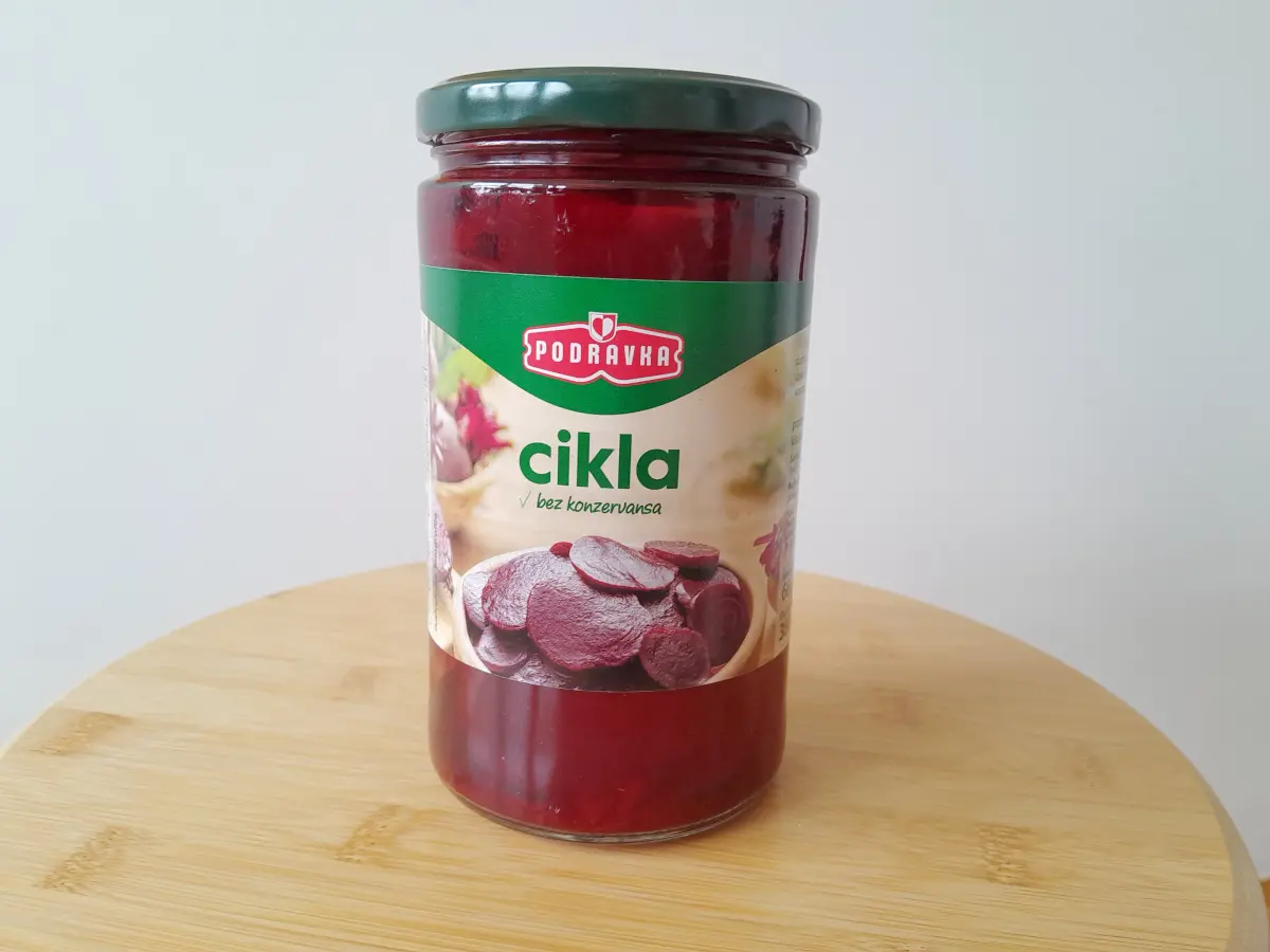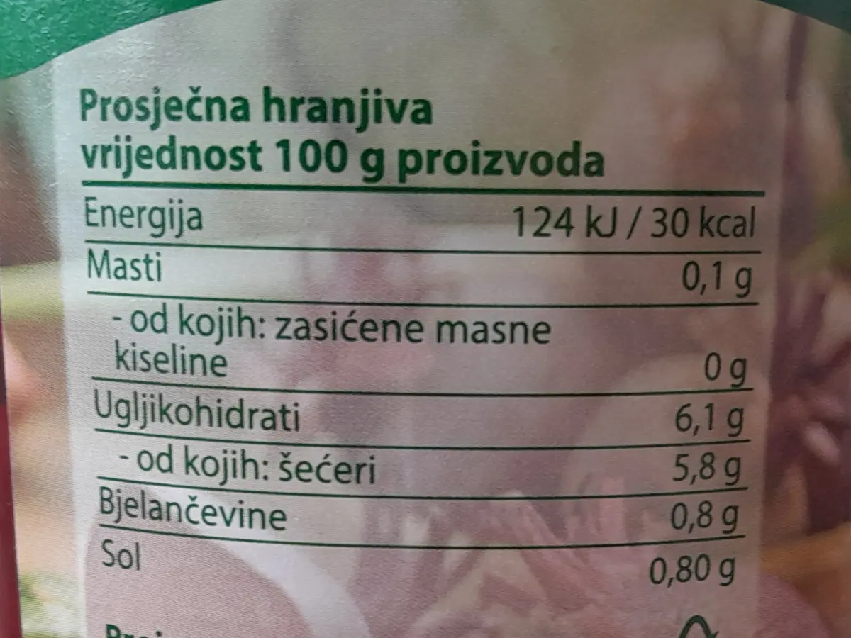 Cikla, voda, alkoholni ocat, šećer, jodirana sol i prirodna aroma.