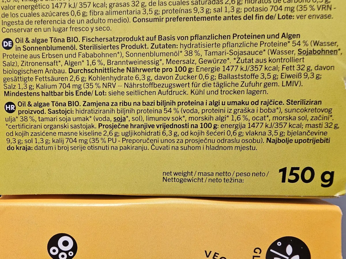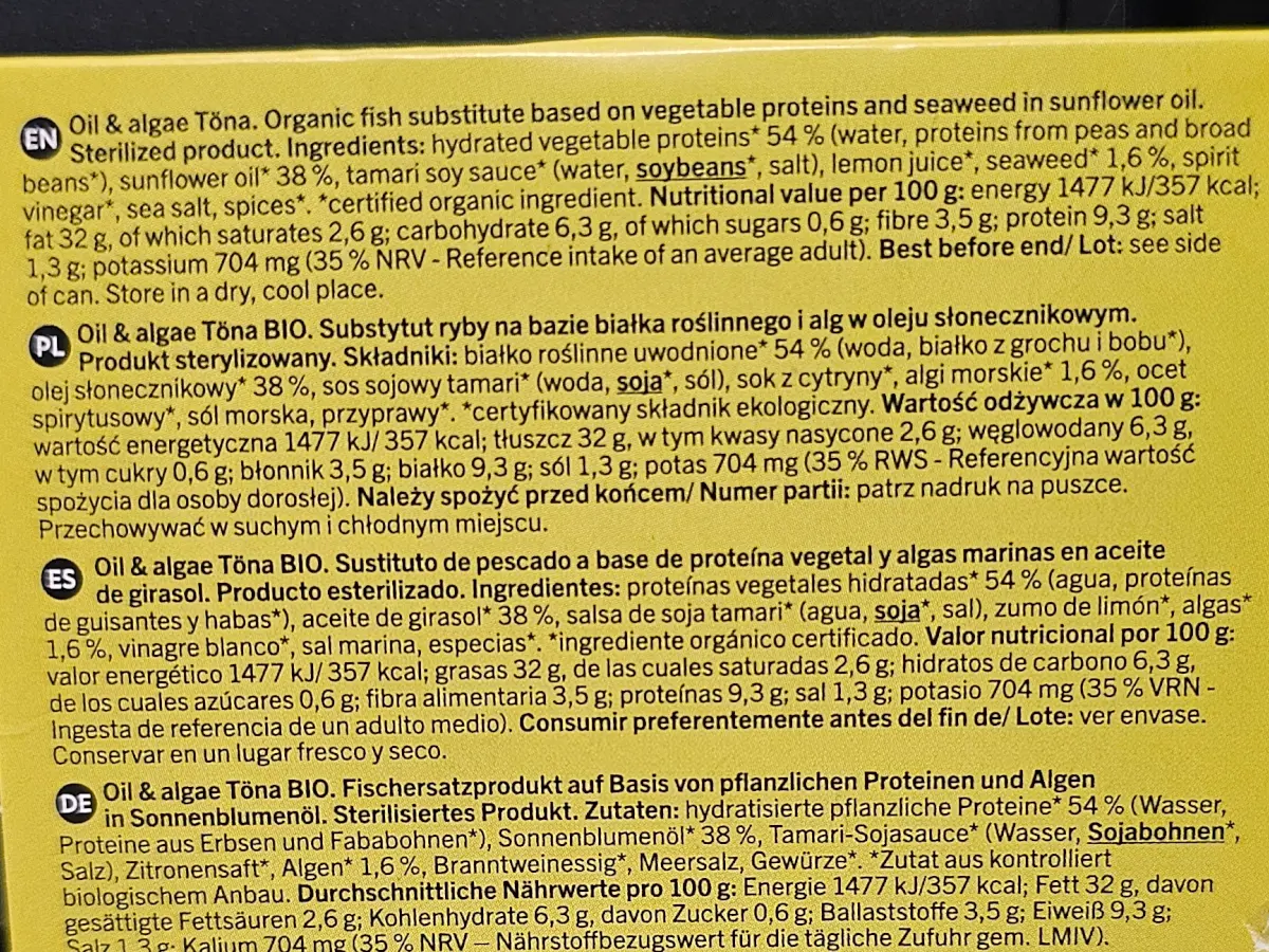 Plant-based tuna alternative.The classic taste of tinned fish, achieved through a unique blend of vegetable proteins, organic sunflower oil and aromatic algae.A product ideal as an addition to salads, pasta or sandwiches.