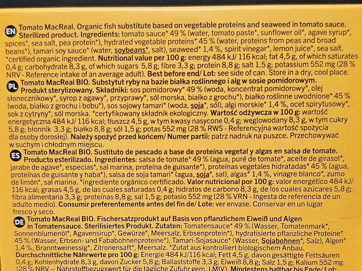 A plant-based alternative to traditional mackerel in tomatoes, based on a recipe from an old Polish fish processor.