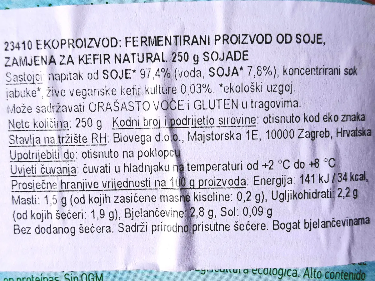 Napitak od soje* 97,4 %, koncentrirani sok od jabuke*, žive veganske kefir kulture 0,03 %