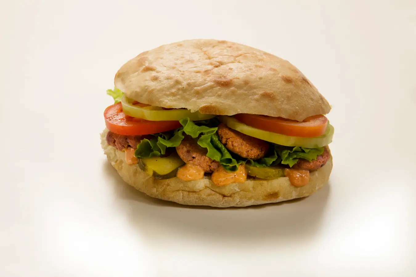 Falafel od slanutka, kvinoje i vučjeg boba, lepinja, veganski umak, zelena, salata, rajčica, paprika, kiseli krastavci