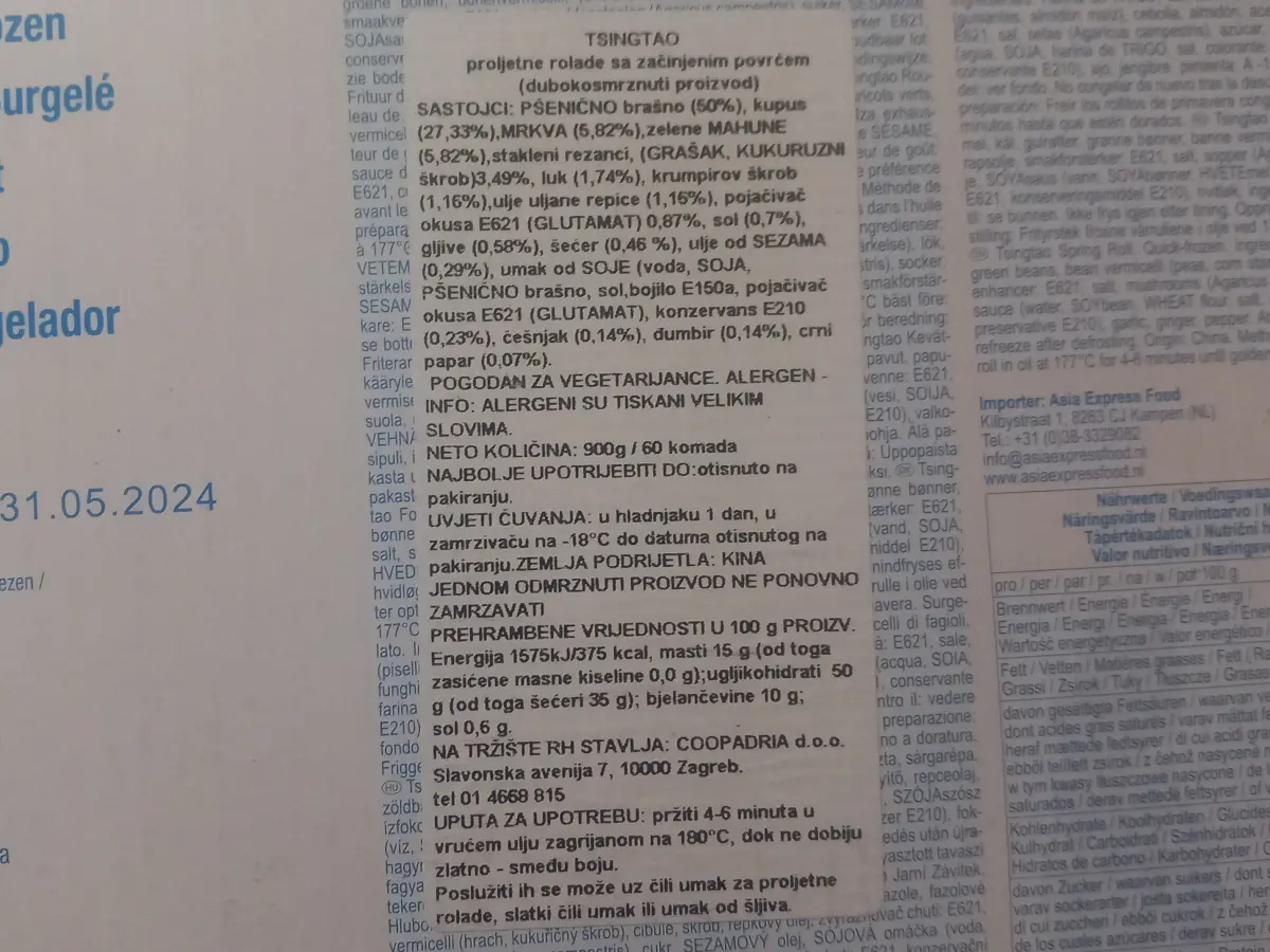 Pšenično brašno (50 %), kupus (27,33 %), mrkva (5,82 %), zelene mahune (5,82 %), stakleni rezanci (grašak i kukuruzni škrob) (3,49 %), luk (1,74 %), krumpirov škrob (1,16 %), ulje uljane repice (1,15 %), pojačivač okusa E621 (glutamat) (0,87 %), sol (0,7 %), gljive (Agaricus campestris) (0,58 %), šećer (0,46 %), ulje od sezama (0,29 %), umak od soje (voda, soja, pšenično brašno, sol, bojilo E150a, pojačivač okusa E621 glutamat, konzervans E210) (0,23 %), češnjak (0,14 %), đumbir (0,14 %), crni papar (0,07 %)