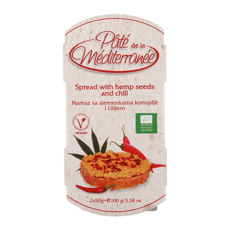 Voda, slanutak-ekološki uzgoj, djevičansko hladno prešano suncokretovo ulje - ekološki uzgoj, hladno prešano maslinovo ulje - ekološki uzgoj, sušena rajčica-ekološki uzgoj, sjemenke konoplje(cannabis sativa)-ekološki uzgoj, proteini krumpira, morska sol, beta glukan, bijeli papar, guar guma, čili