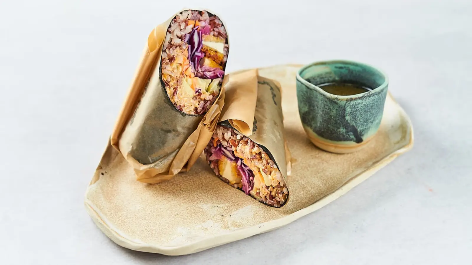 Nori alga, riža, zelena salata, mrkva, krastavac, crveni kupus, ukiseljeni luk, tofu katsu, ljuta plant based majoneza (325 g)