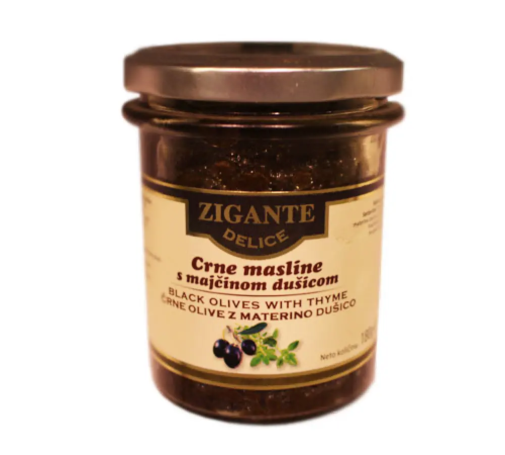 crne masline 77 %, ekstra djevičansko maslinovo ulje, majčina dušica 0,3 %, začini