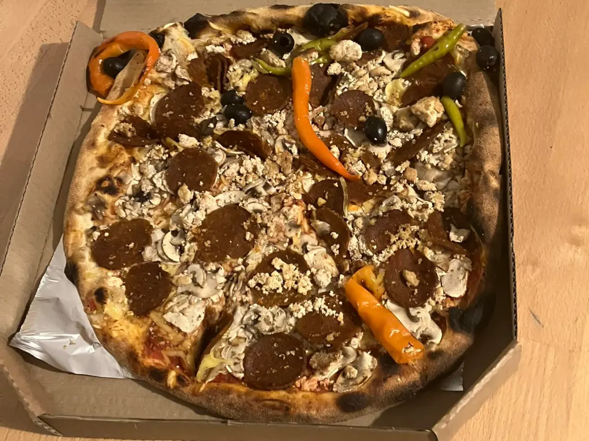 Pulpa, Violife veganski sir, Primavita veganska mozzarella, Stellina kobasica, dimljeni tofu, blagi ili ljuti feferoni, masline, origano.