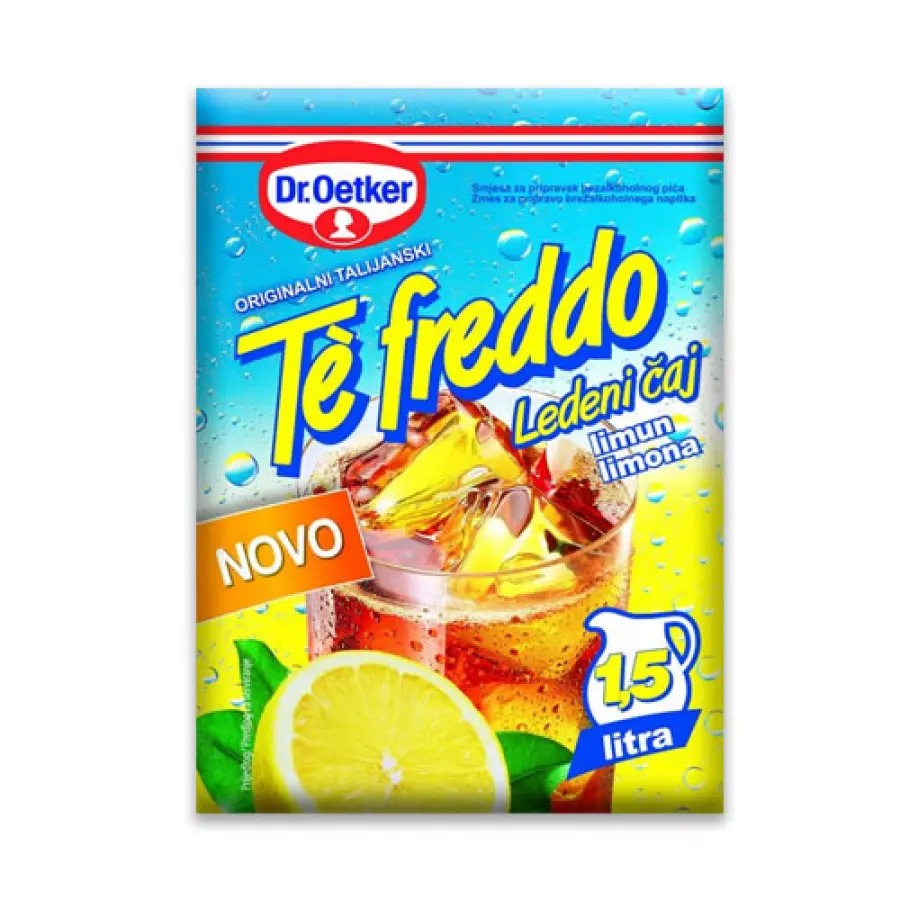 šećer, regulator kiselosti: limunska kiselina, topivi ekstrakt čaja, aroma, dehidrirani sok od breskve (0.2 %)Proizvod može u tragovima sadržavati mlijeko, jaja, lješnjake, bademe i soju