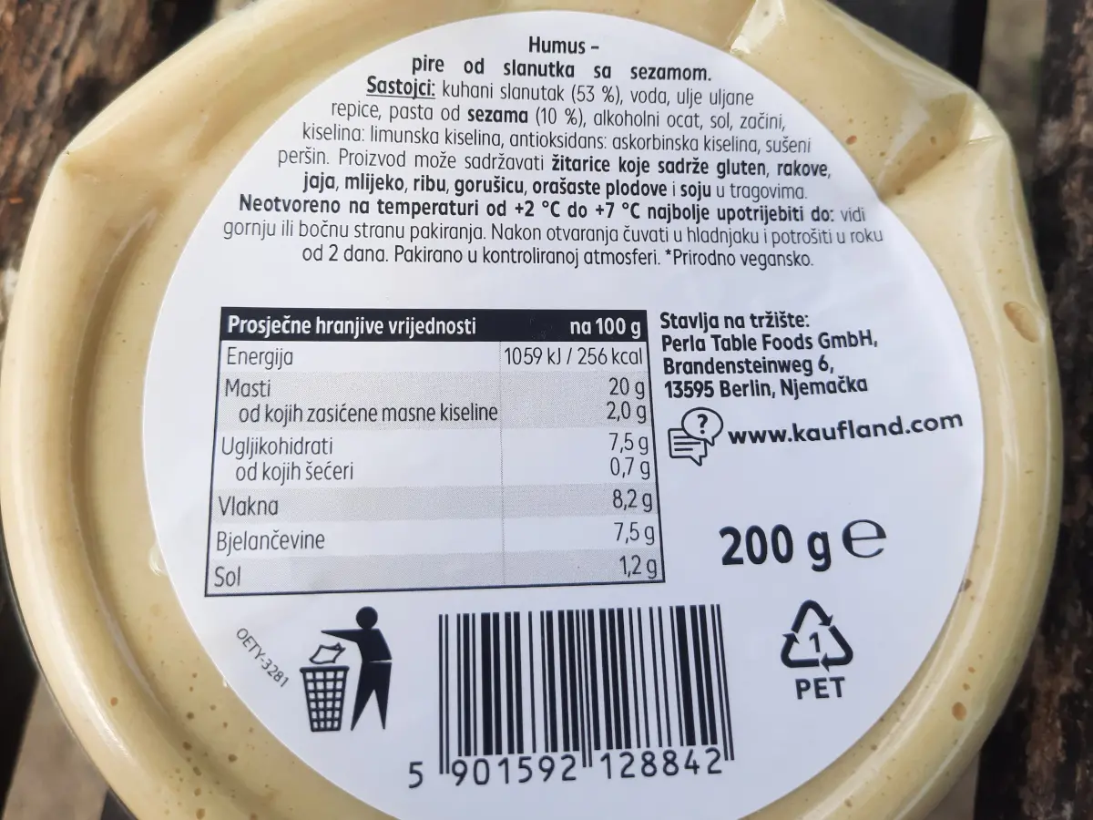 Kuhani slanutak (53 %), voda, ulje uljane repice, pasta od sezama (10 %), alkoholni ocat, sol, začini, kiselina: limunska kiselina, antioksidans: askorbinska kiselina, sušeni peršin.