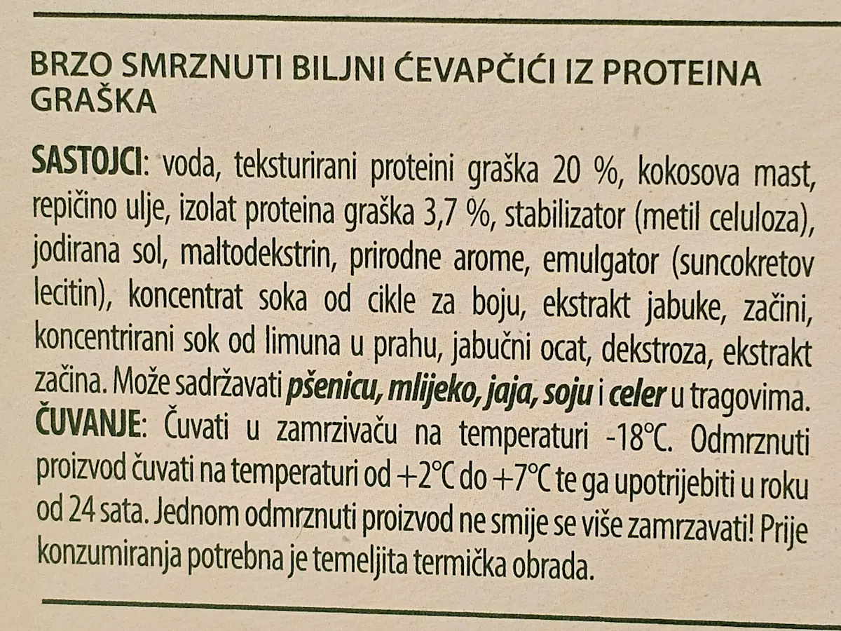 Voda, teksturirani proteini graška 20 %, kokosova mast, repičino ulje, izolat proteina graška 3,7 %, stabilizator (metil celuloza), jodirana sol, maltodekstrin, prirodne arome, emulgator (suncokretov lecitin), koncentrat soka od cikle za boju, ekstrakt jabuke, začini, koncentrirani sok od limuna u prahu, jabučni ocat, dekstroza, ekstrakt začina.