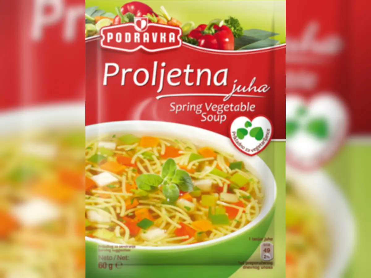 Tjestenina 42 % (durum pšenična krupica), kuhinjska sol, sušeno povrće 9,5 % (mrkva, celer, krumpir, luk, poriluk, crvena paprika, cvjetača), kukuruzni škrob, pojačivači okusa (mononatrijev glutaminat, dinatrijev inozinat), biljna mast, šećer, maltodekstrin, kvašćev ekstrakt, začini, bojilo (obični karamel), peršin list.