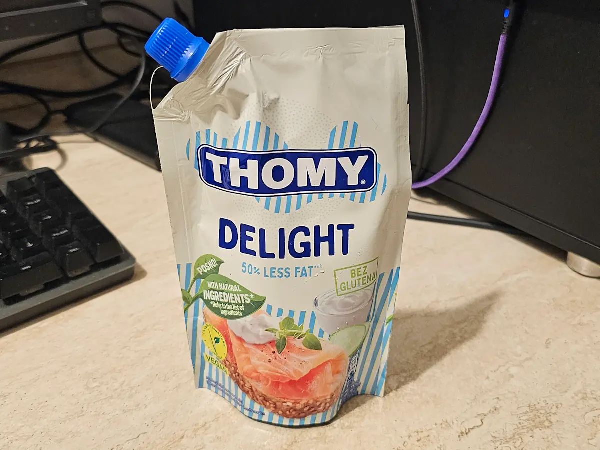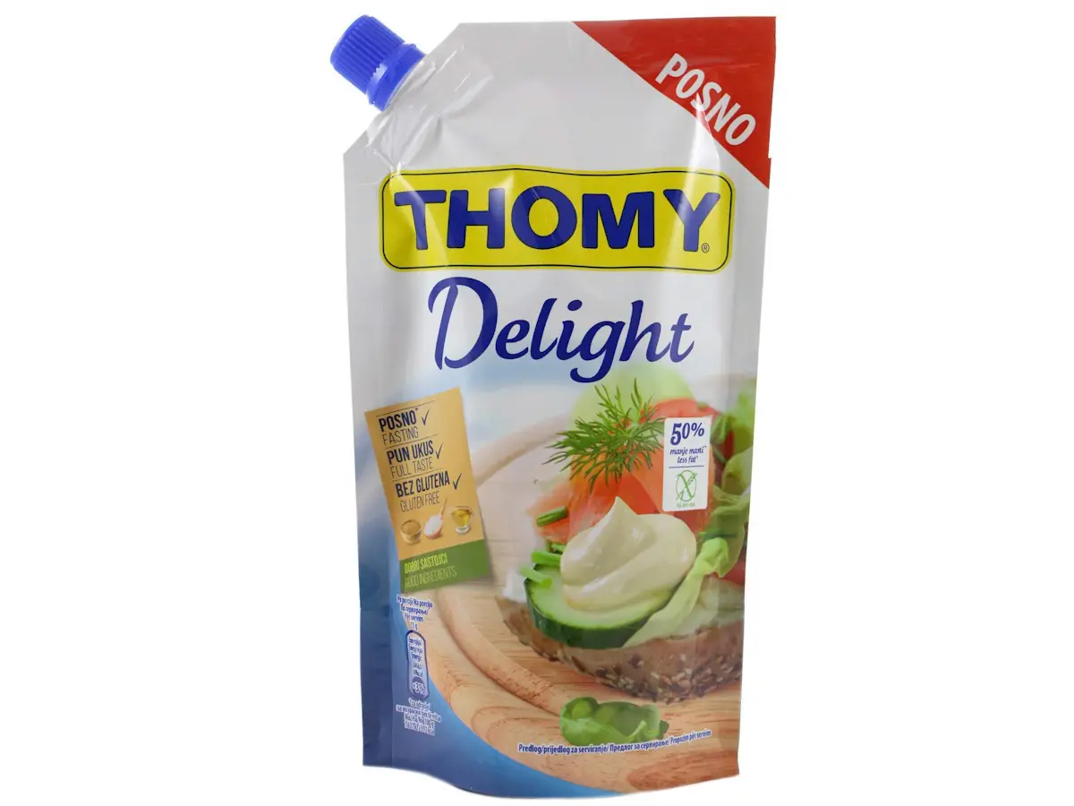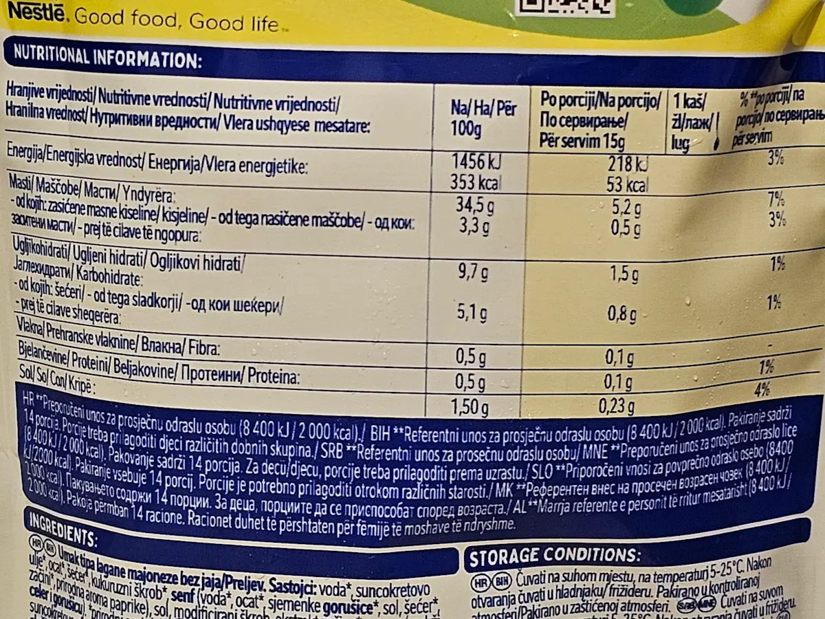 Voda, suncokretovo ulje 39 %, kukuruzni škrob, ocat, šećer, senf (sjeme goruščiće, ocat, sol, začini, aroma), sol, arome (sadrži celer i goruščicu).