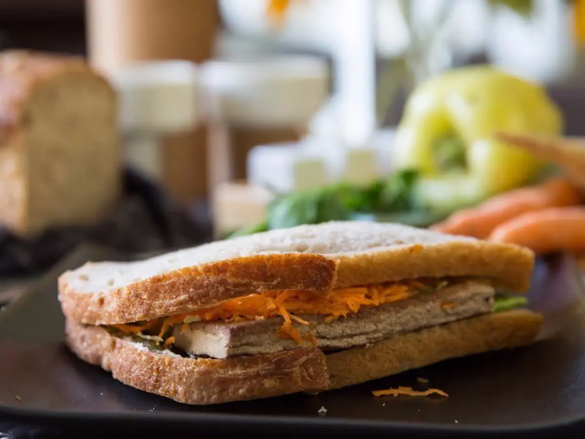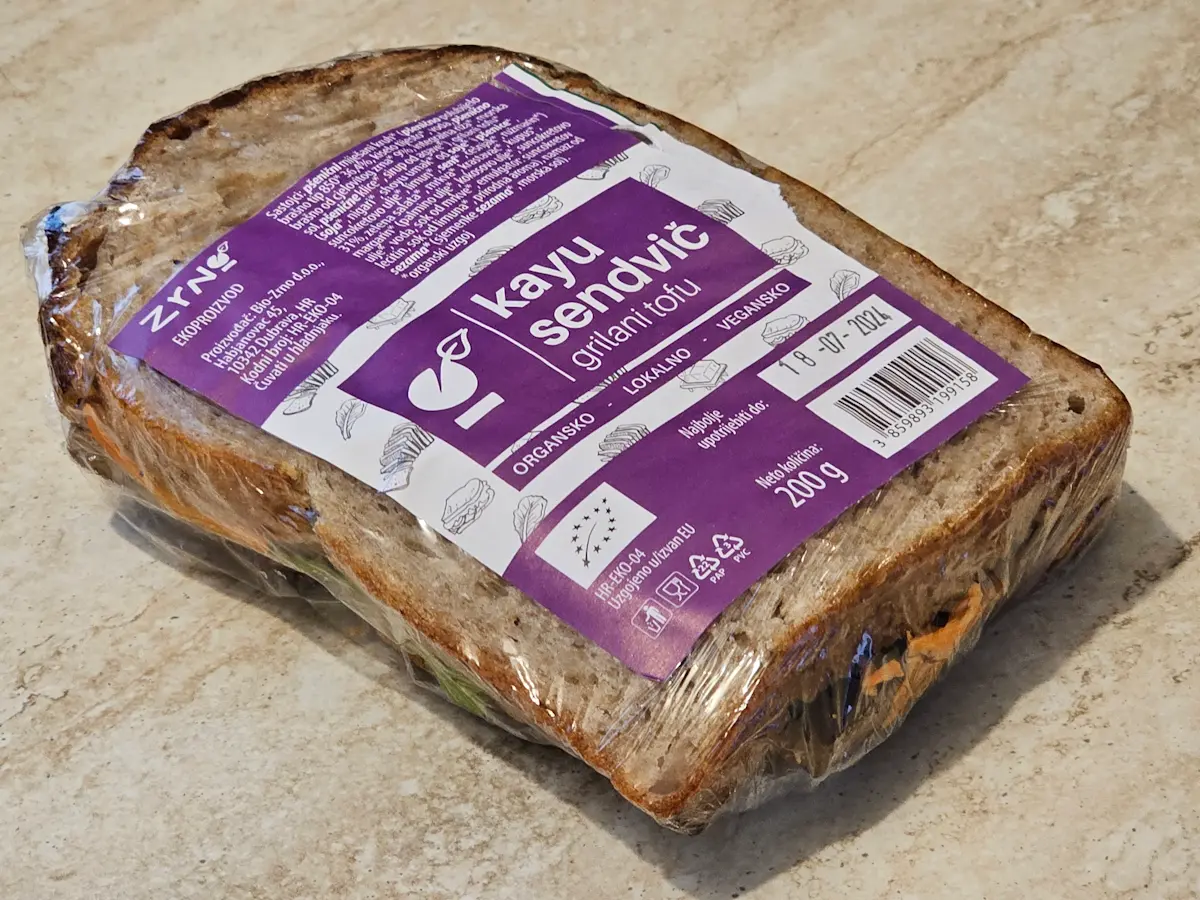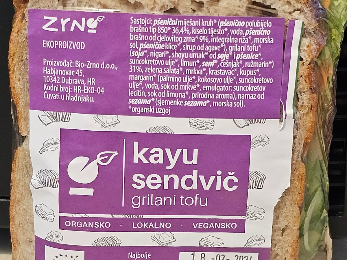 Pšenični miješani kruh, grilani tofu 31 % (soja, nigari, soja sos, suncokretovo ulje, limun, senf, češnjak, ružmarin), salata, mrkva, krastavac, kupus, margarin, maslac od sezama.