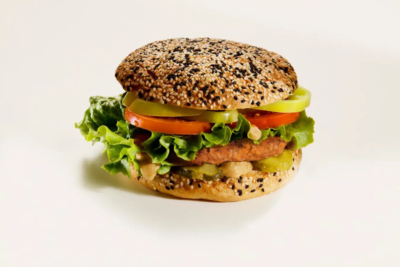 Bezglutenska pljeskavica od slanutka, kvinoje i vučjeg boba, bezglutenska lepinja, veganski umak, zelena salata, rajčica, paprika, kiseli krastavci