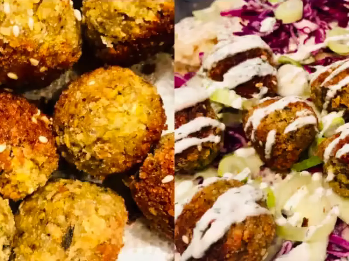 Handmade falafel kuglice (slanutak, kurkuma, mrkva, češnjak, sol, papar, pšenično brašno; cca 100 g); u tostiranoj lepinji, povrće, kupus, umak s koprom.