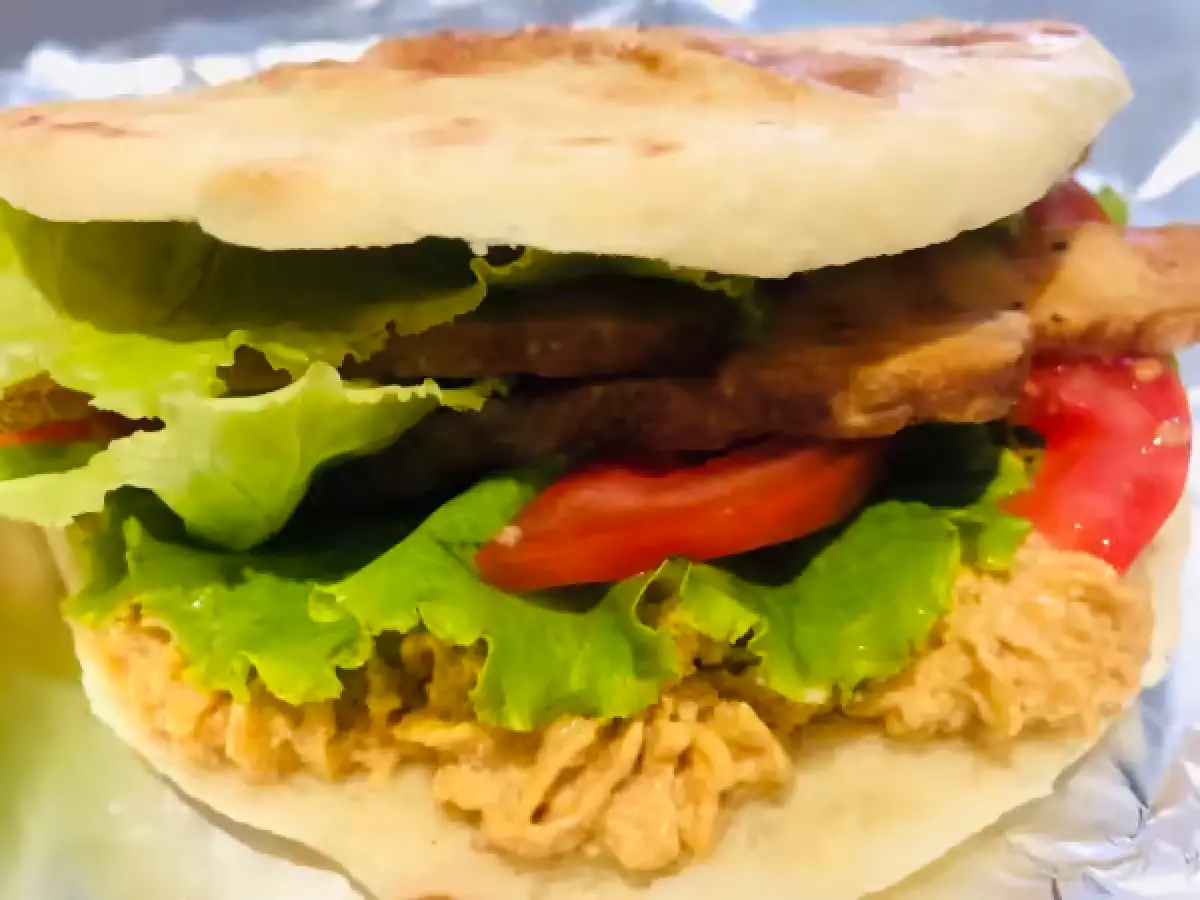 Domaće pecivo (ručno rađeno), domaći namaz od suncokreta, dimljene paprike, rajčica, dimljeni tempeh, zelena salata.