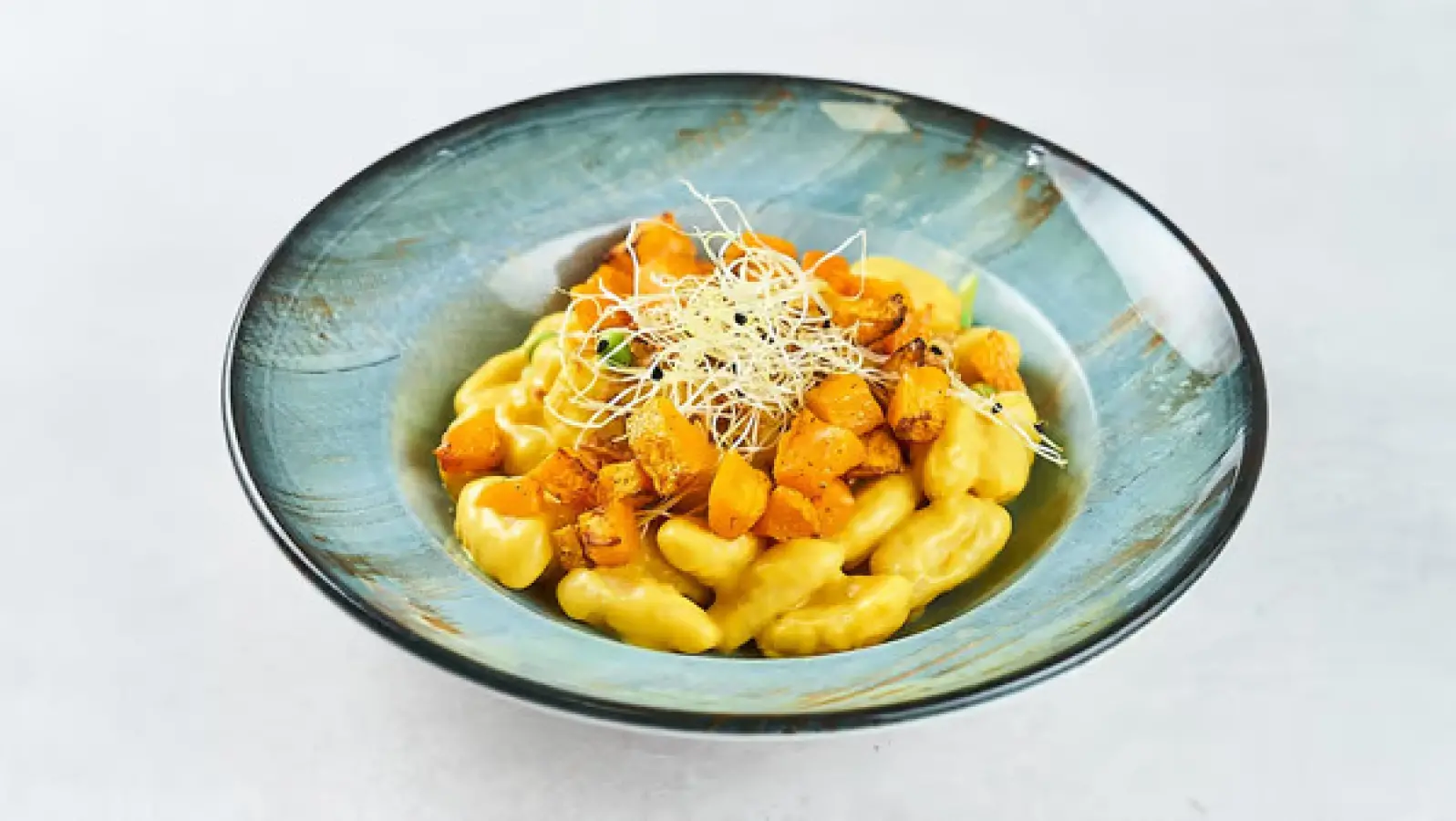 Njoki od kvinoje, povrtni cheddar umak, tartufata, grašak, pečena buča, hrskavi luk (260 g)